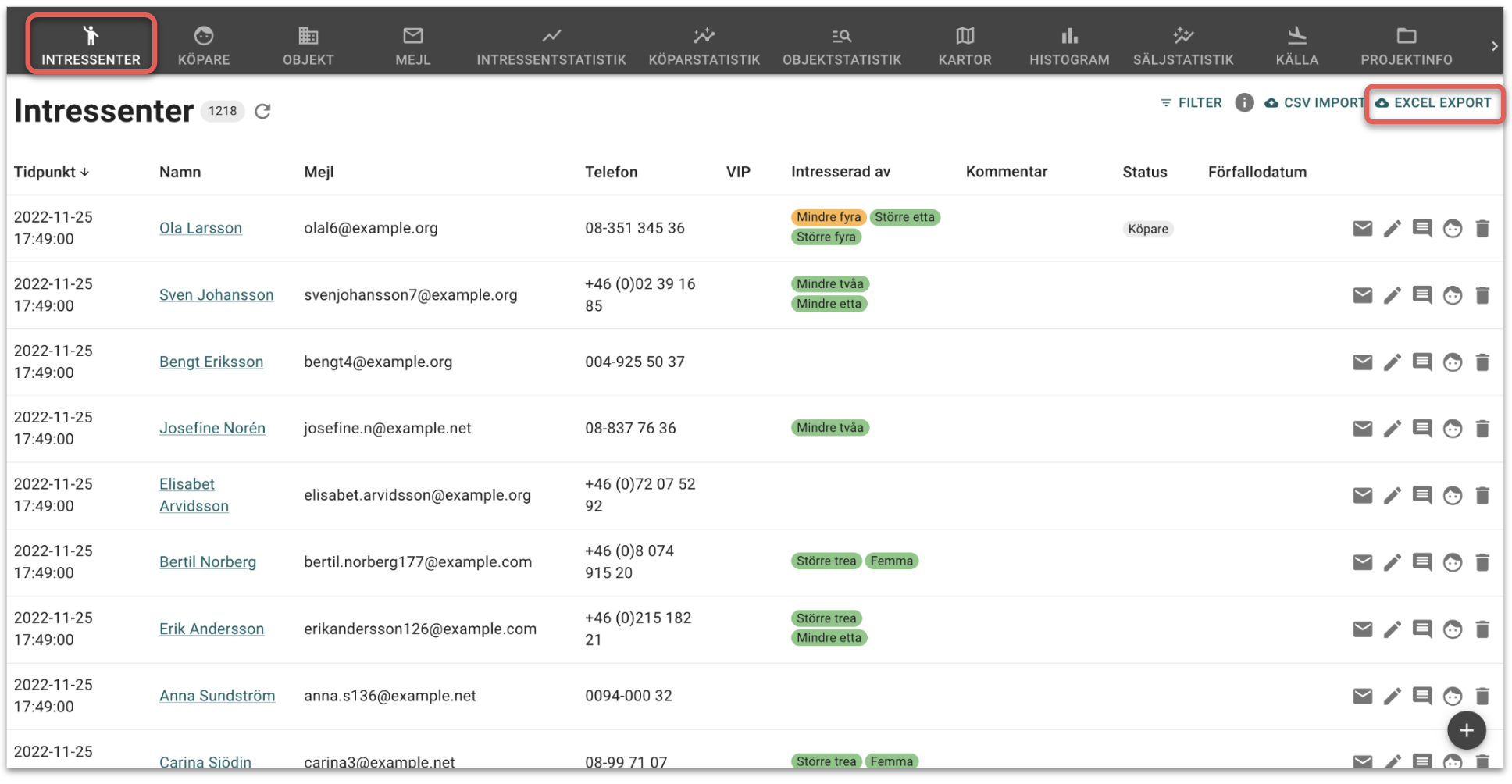 Under flikarna INTRESSENTER/KÖPARE/OBJEKT kan du genom EXCEL EXPORT exportera/ladda ner en sammanställd Excel-fil. Klicka på knappen där det står EXCEL EXPORT för att exportera listan till din enhet. Exemplet nedan är från fliken INTRESSENTER men det är samma förfaringssätt för flikarna KÖPARE och OBJEKT.