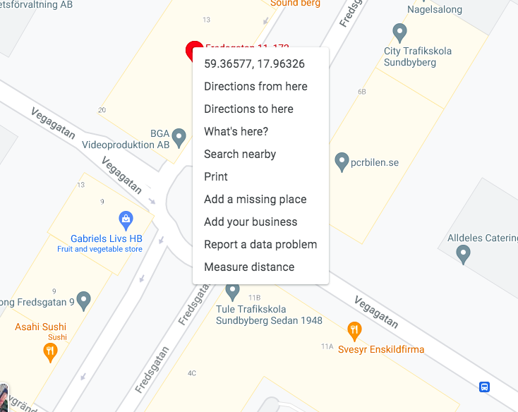 Högerklicka på den knappnål som visar den plats du vill hämta (OBS på mac kan det krävas att du håller ner både höger- och vänstertangenten). När du högerklickar på knappnålen dyker en snabbmeny upp. Det första som visas i menyn är latitud och longitud för platsen. Klicka på den för att kopiera koordinationerna.