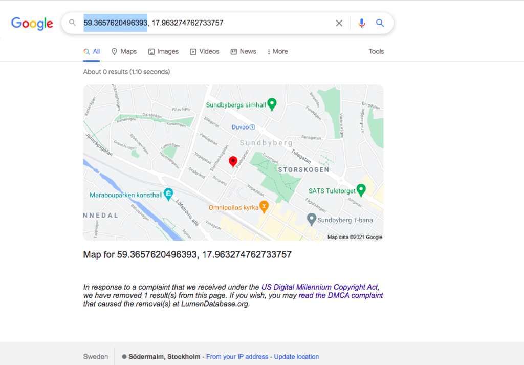 Du har nu kopierat både latitud och longitud. För att skriva in koordinationerna behöver du klistra in latitud för sig och longitud för sig. Ett enkelt sätt att dela på koordinationerna är att gå upp till ditt adressfält, högerklicka och klicka på “Klistra in och sök”. Du gör alltså en sökning med koordinationerna och kan då samtidigt se att intressenterna kommer till rätt plats när de söker efter projektet på detta sätt.