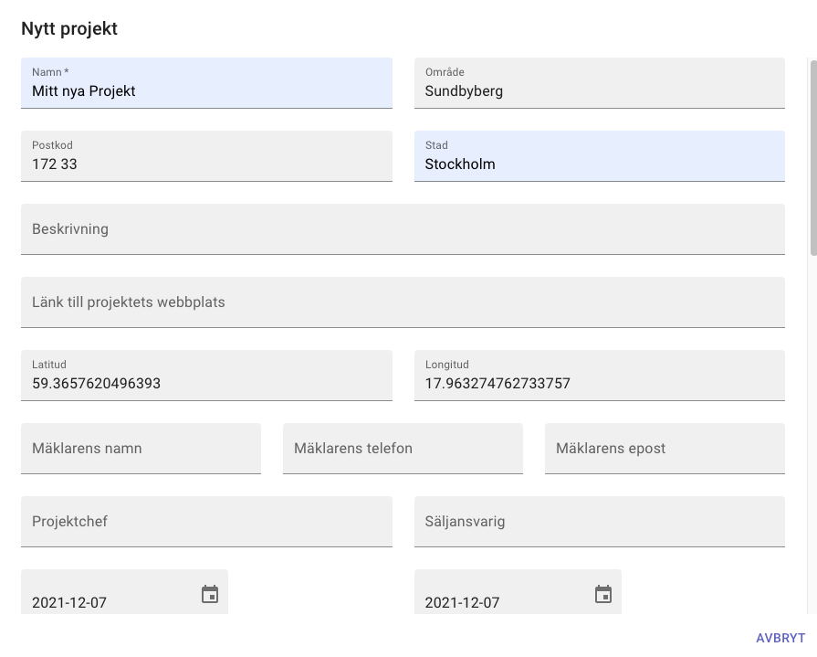 Sista steget är att markera och kopiera latitudkoordinationen och klistra in i latitud-fältet i projekt-formuläret och sedan samma sak med longitud till longitud-fältet.