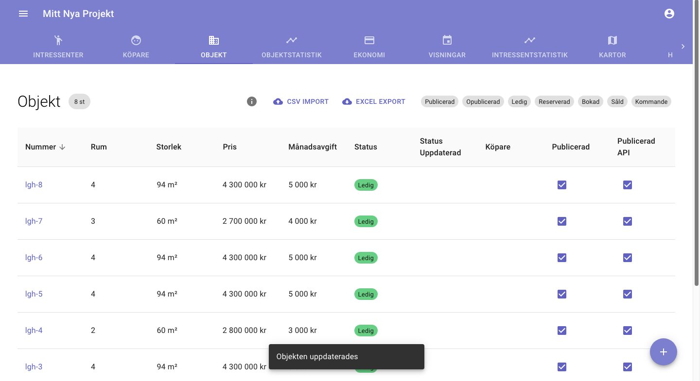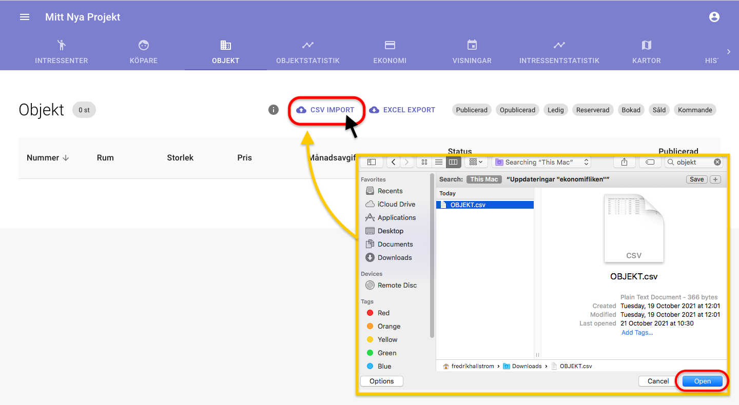 När ditt csv dokument är redo återgår du till objektsidan, klickar på CSV IMPORT och väljer din fil, klicka sedan på öppna. Då laddar du upp objekten som finns i filen direkt till systemet.