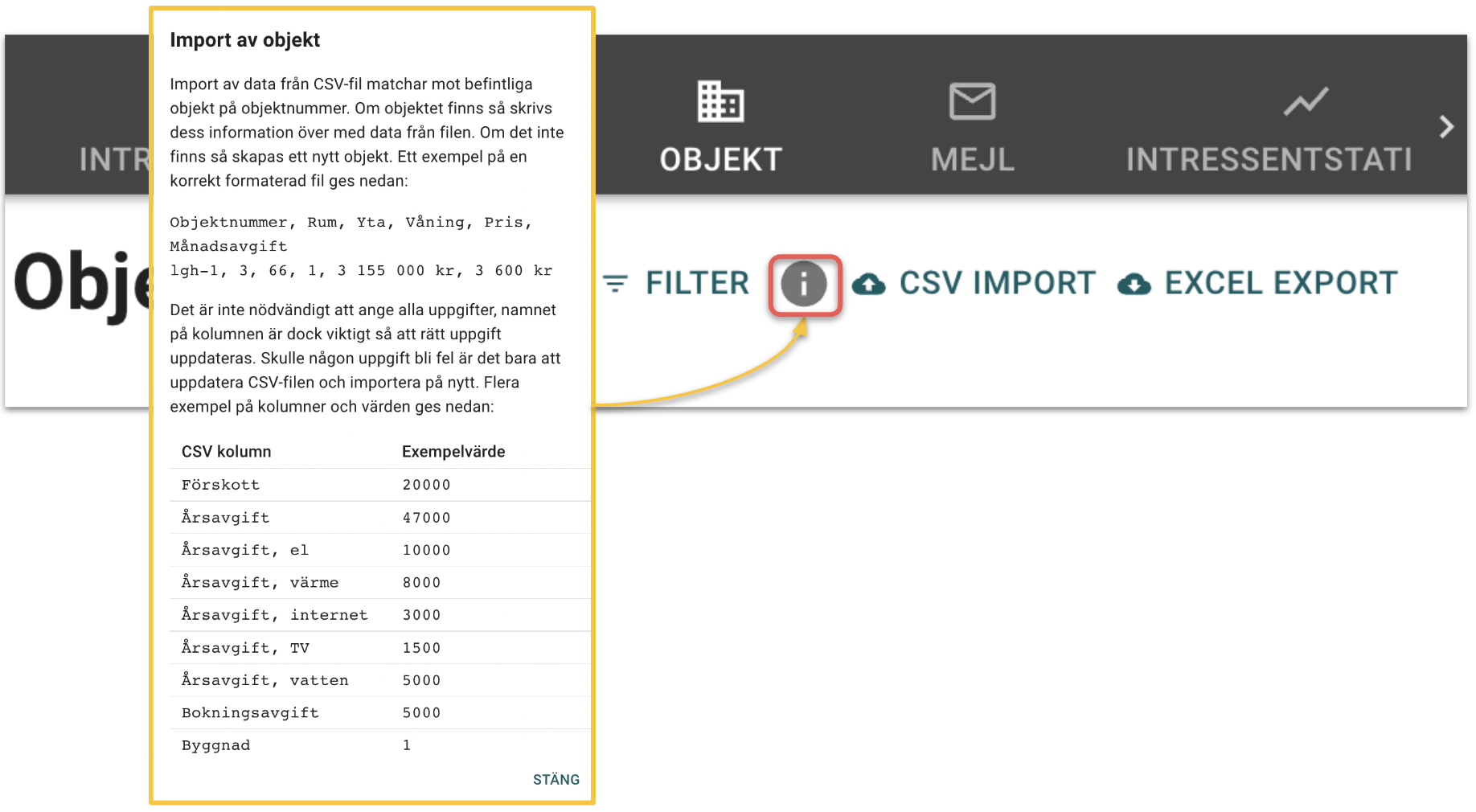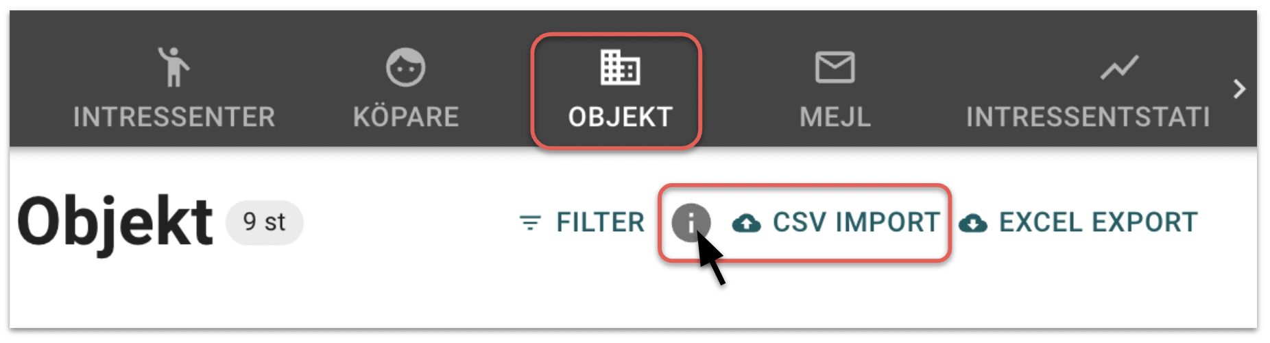 Här kan vi effektivisera inmatningen av objekt genom comma-separated values (csv). Det gör du genom att klicka på CSV IMPORT från fliken OBJEKT.