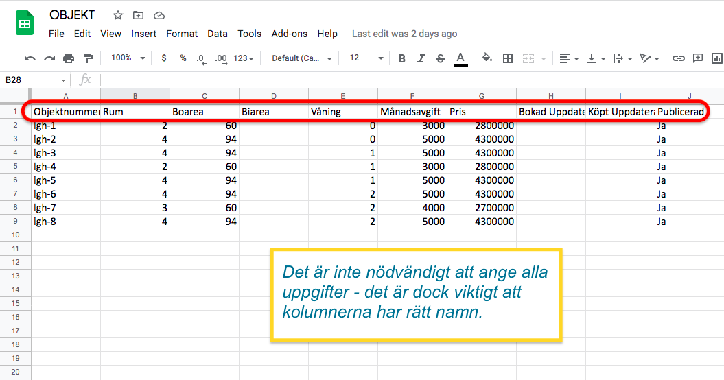 Objektslistan som du vill importera kan exempelvis skapas i Excel eller Google sheets – och dylika program. Filen sparas ner i ett filformat som slutar med .csv