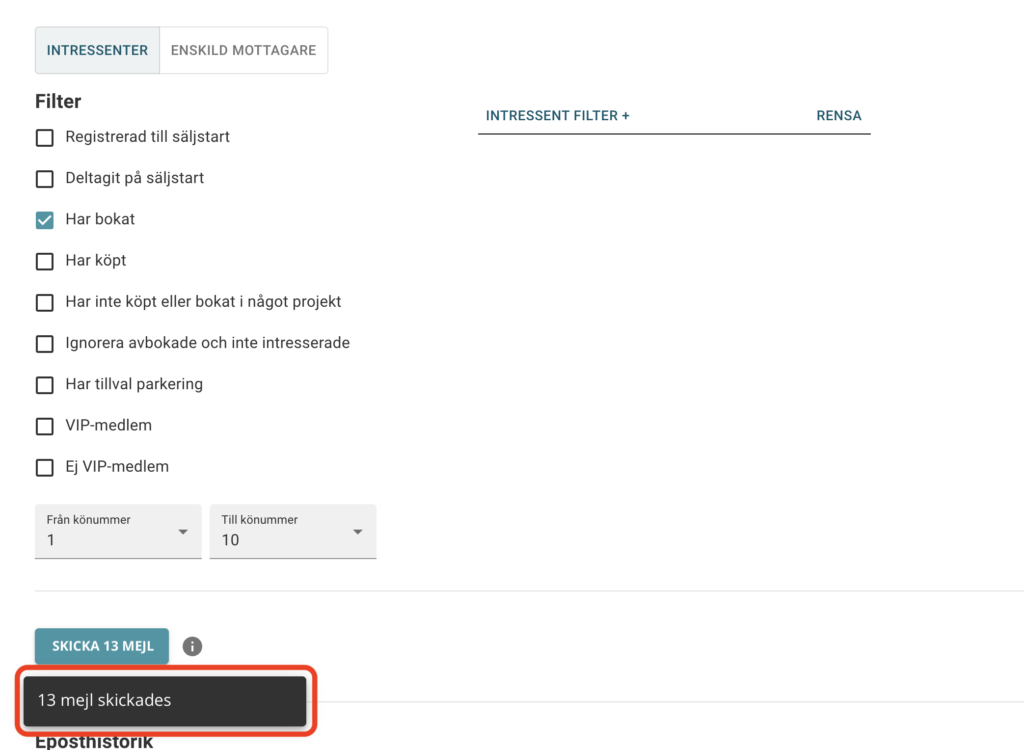 Du kan även använda INTRESSENT FILTER + för att filtrera på specifika bostäder. Då kan du exempelvis välja att endast skicka mejlet till intressenter som anmält intresse för lägenheten 1-1002. Du kan även välja de intressenter som inte gjort något val respektive de som gjort intresseanmälan.