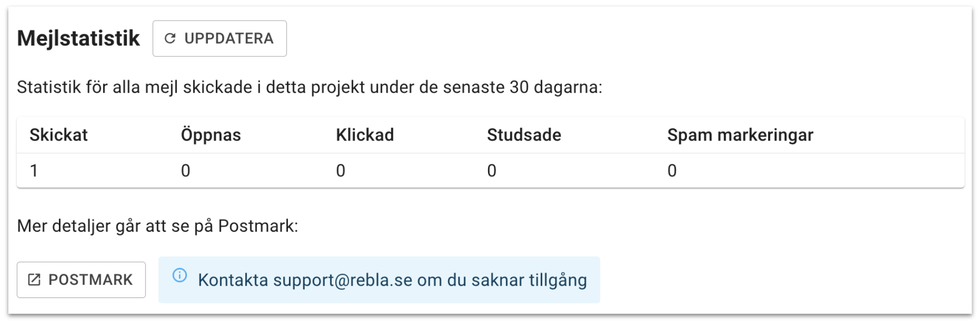 När man har skickat iväg mejl kan man ta del av mejlstatistiken. Detta innebär att du kan se hur många mejl som har skickats ut, om mottagarna har öppnat mejlet och även om de har klickat på eventuell länk i mejlet.