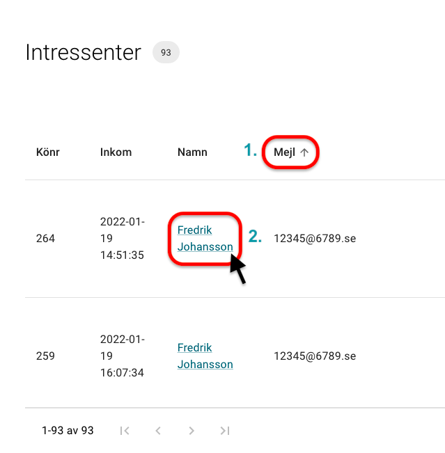 Steg 2: Klicka därefter på Mejl (se den första markeringen) för att sortera intressent-listan efter e-postadress. Då lägger sig dubbletterna efter varandra. Du behöver alltså gå igenom listan manuellt – men det kommer vara betydligt enklare att hitta dubbletterna.