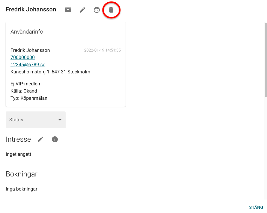 Är du orolig för att råka trycka på fel rad så kan du även klicka in på intressentens namn. Då kommer du till en dialogruta som innehåller intressentens person- och kontaktuppgifter. Där finns också en “papperskorg” – klicka på den.