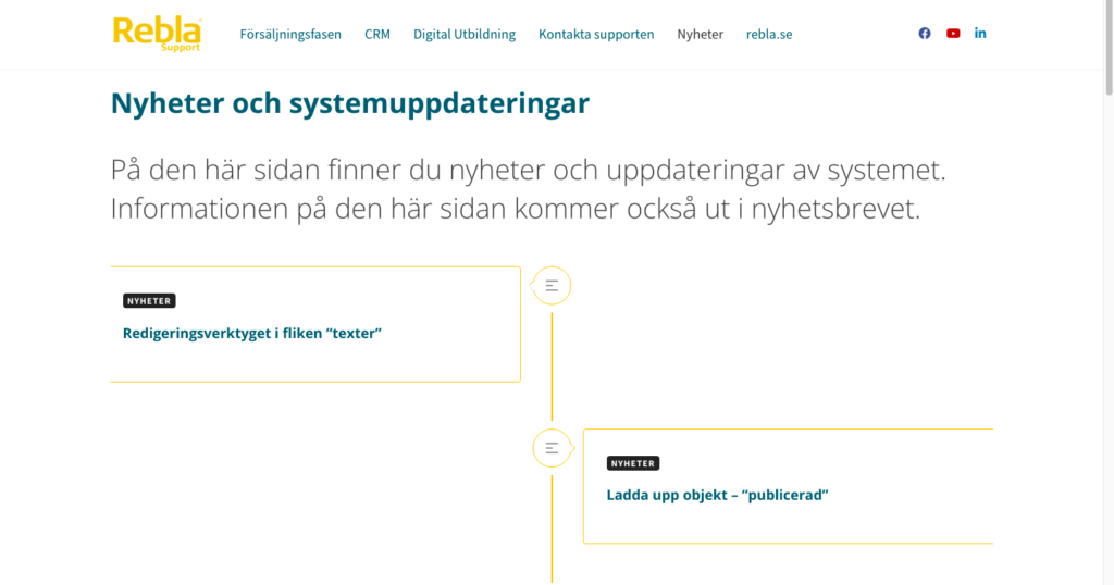 Det fjärde menyvalet är “release notes” – när du klickar på den dirigeras du till vår nyhetssida. Här publicerar vi uppdateringar av systemet – såsom nya funktioner och buggfixar. Vi uppdaterar systemet kontinuerligt – i takt med att nya behov uppstår. Att lyssna på kundens behov är nummer ett för oss. Så om du saknar en funktion – kontakta supporten! Vi uppskattar all input vi kan få.