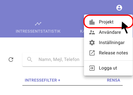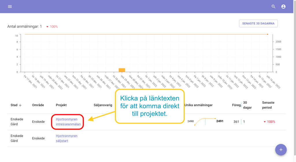 Den vy du möts av då är din projektöversikt – med en sammanställning av intresseanmälningar för samtliga av dina projekt.