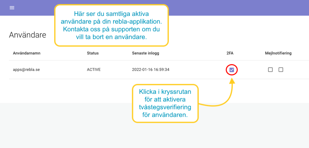 Klicka sedan på “användare”. Här ser du alla användare som har tillgång till ditt konto.