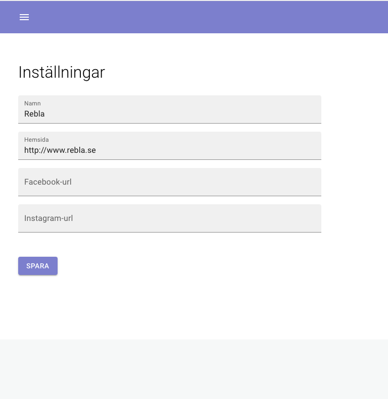 Nästa är “inställningar” – där du kan skriva in url för din hemsida och sociala medier. I nuläget har den faktiskt inte någon särskild påverkan på någon annan funktion. Loggan som visas till vänster är densamma som visas i era formulär.